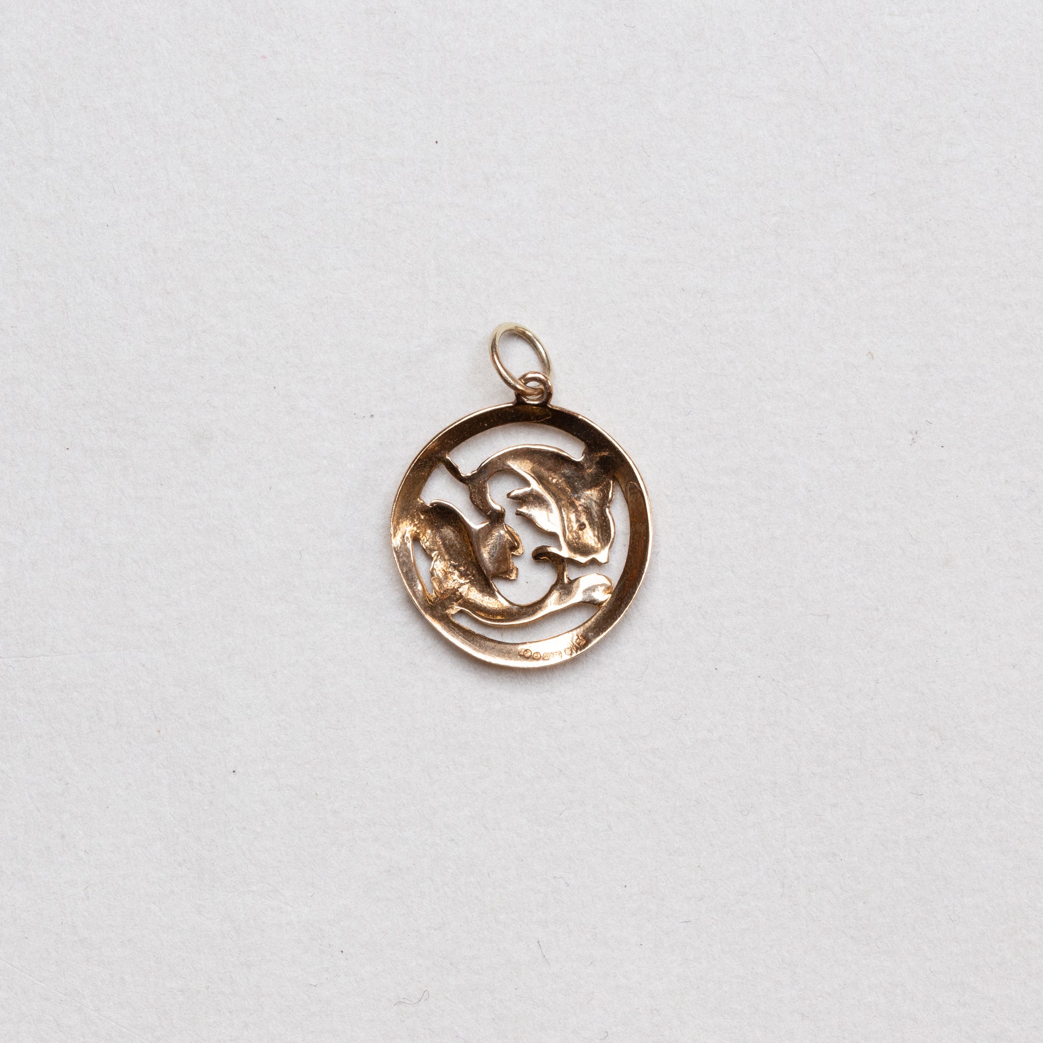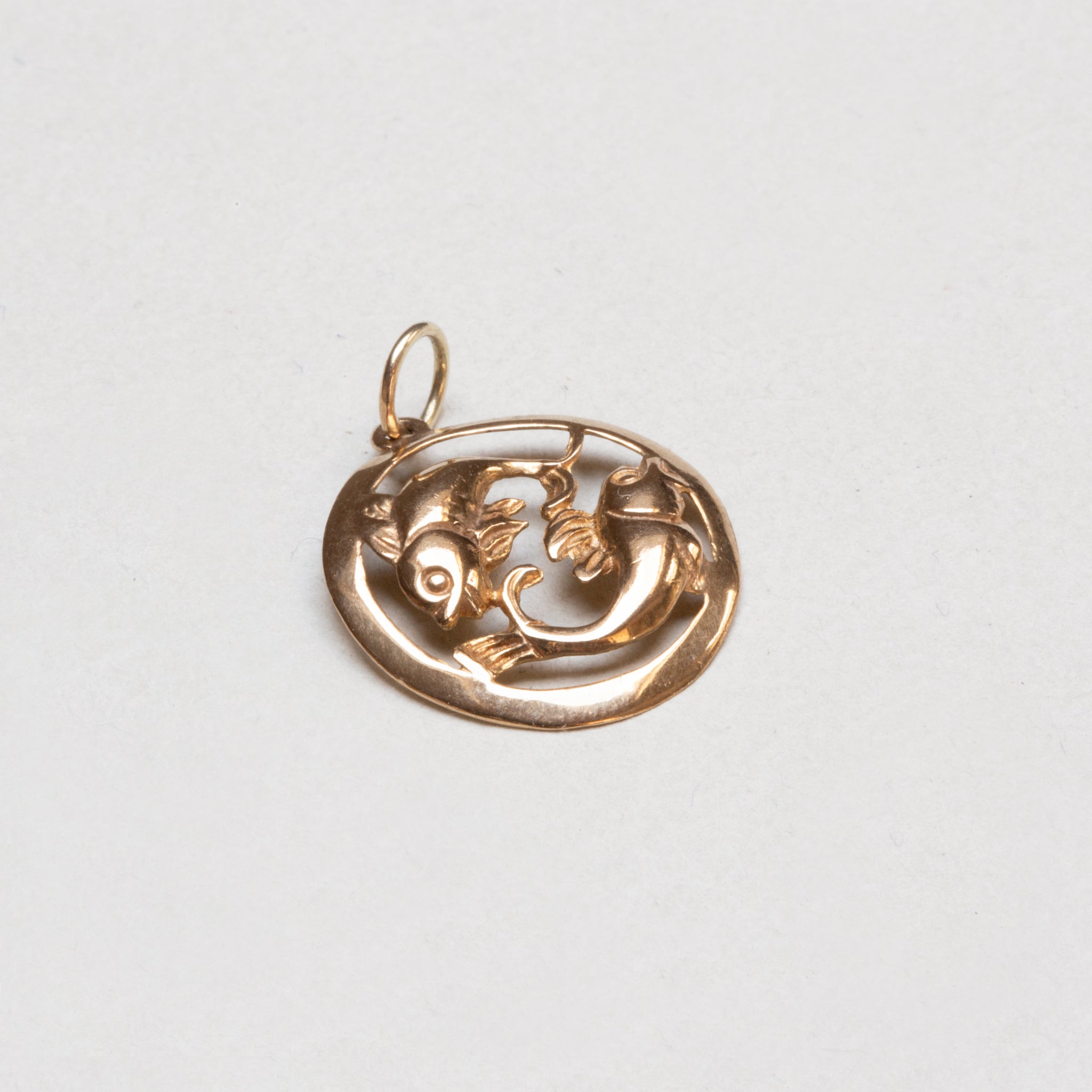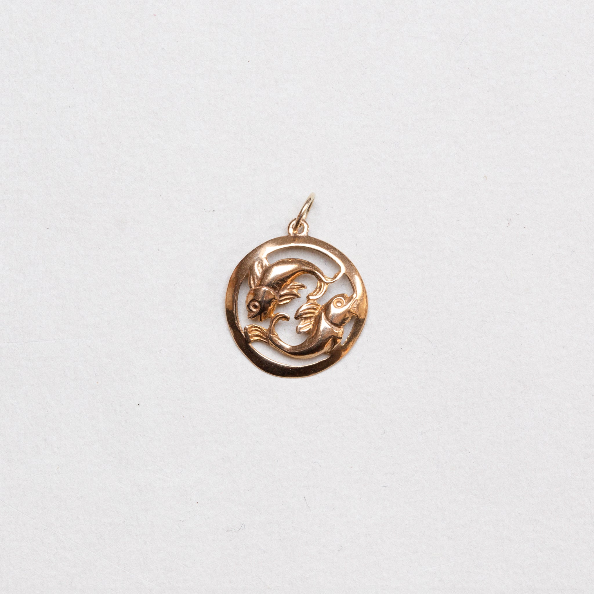 This vintage gold pendant features a finely detailed Pisces motif with two fish in circular motion, framed by an openwork border. Perfect for those born under Pisces or as a meaningful gift for a loved one.