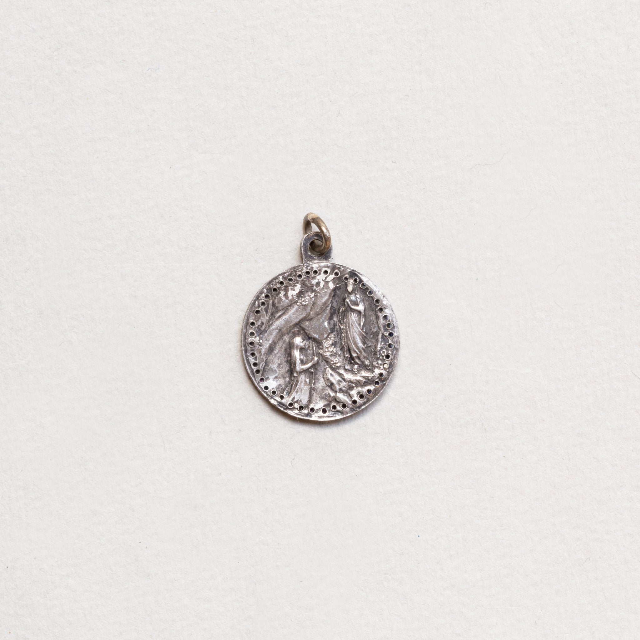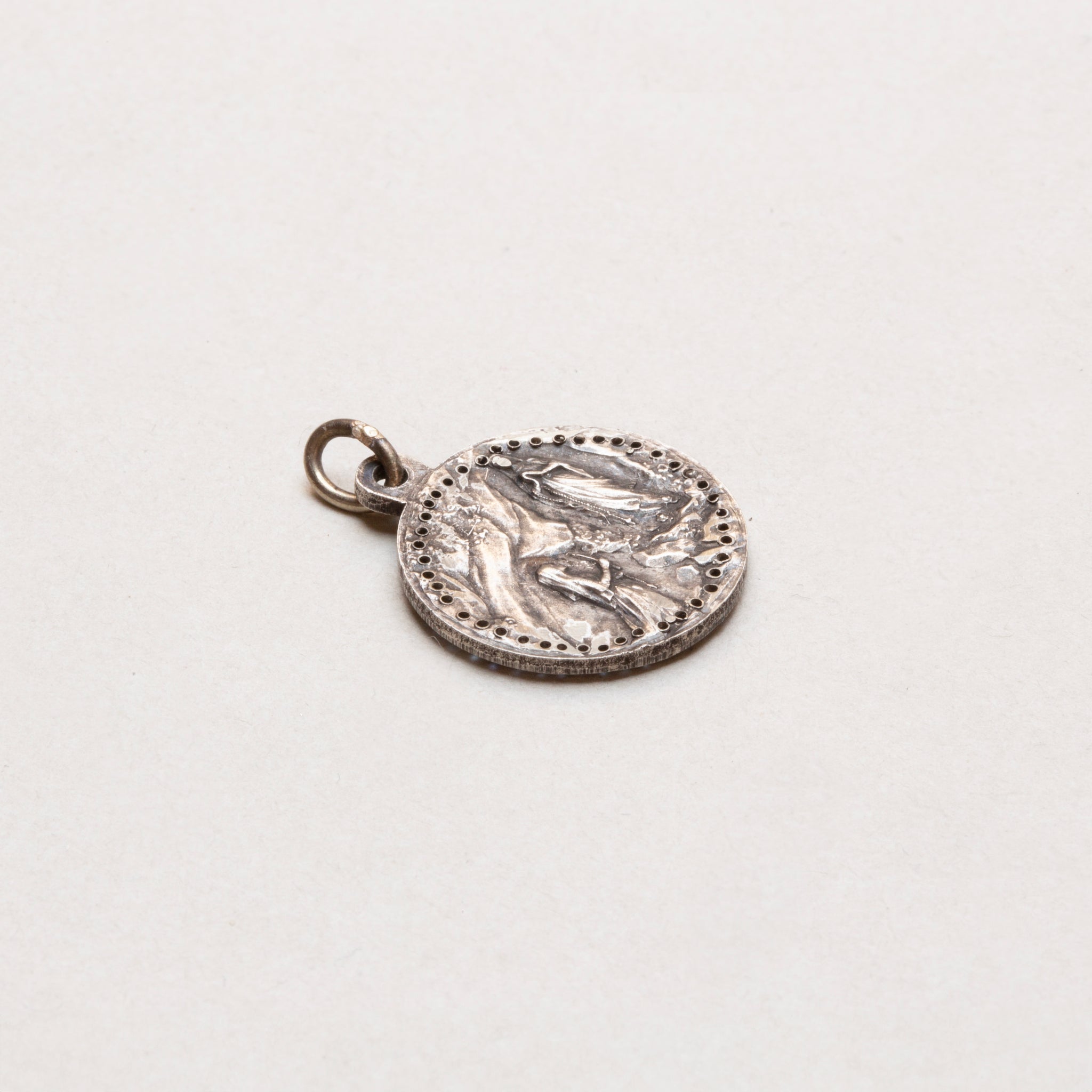 This rare double-sided vintage pendant charm is a true embodiment of timeless beauty and spiritual significance. Made of string silver with blue sapphires, both sides of the charm feature raised relief motifs.