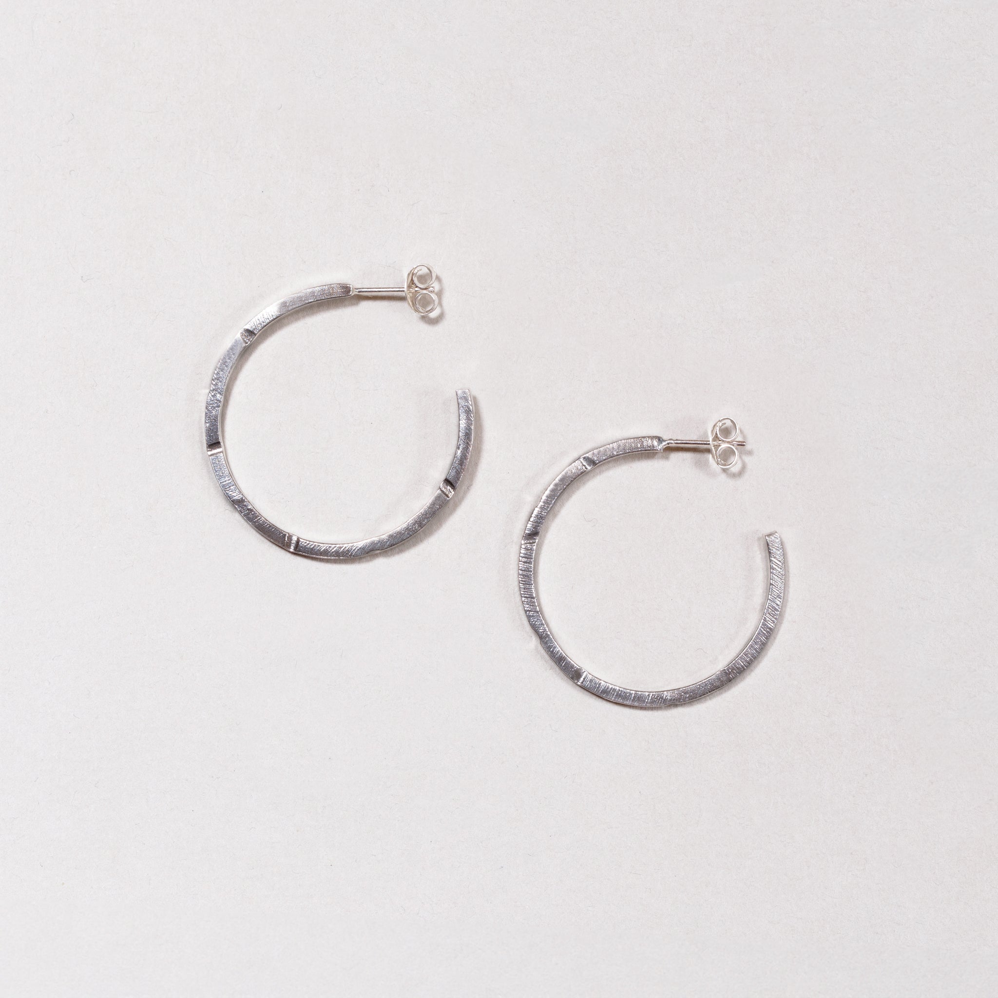 Textured silver open hoop earrings with a stud fitting, perfect for everyday wear.