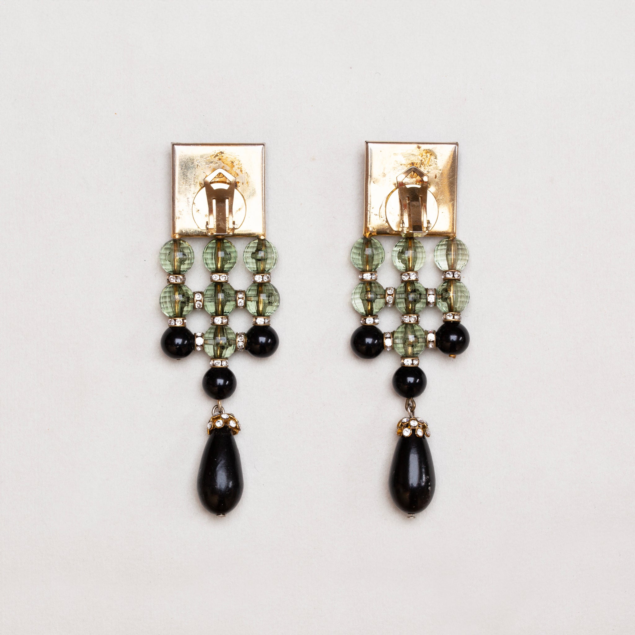 Each earring features a large square black stone at the top, from which hang three rows of faceted pale green beads spaced with rhinestone rondelles and black beads. The design is completed with a black teardrop bead suspended at the base, creating movement and contrast. A striking example of Valentino’s statement jewellery style.