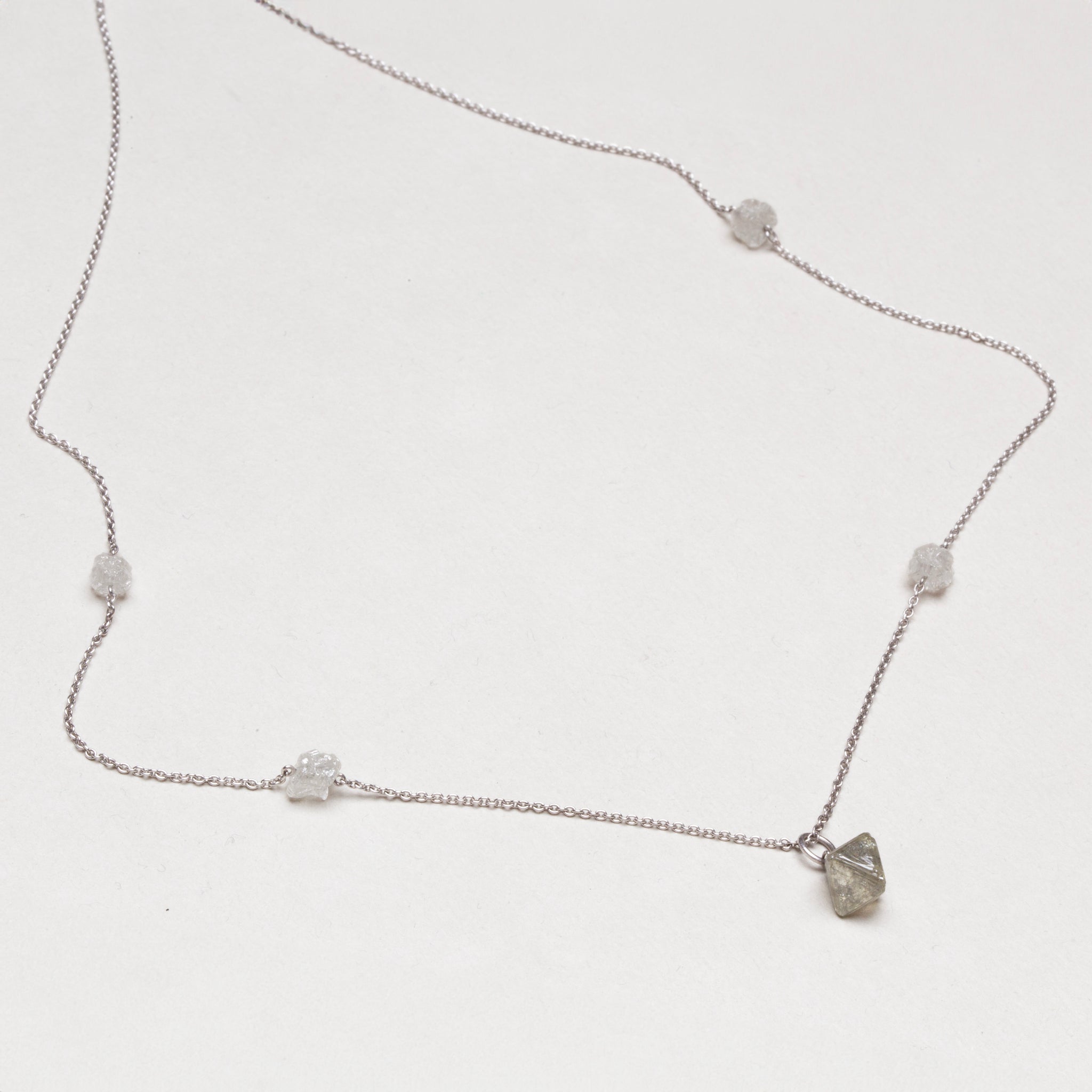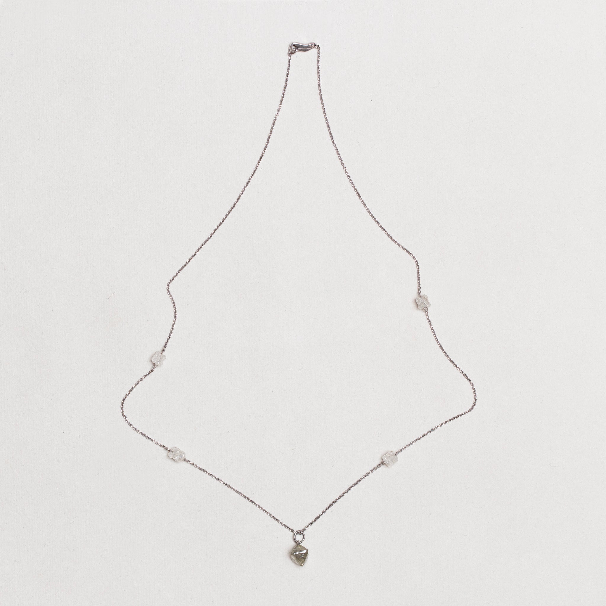 This delicate William Welstead necklace features a fine platinum chain accented with a series of raw, rough-cut diamonds, including a striking diamond pendant at the centre. Known for his use of natural, unpolished stones, William Welstead creates pieces that celebrate organic beauty and understated luxury, and this necklace is a lovely example of his minimalist aesthetic.