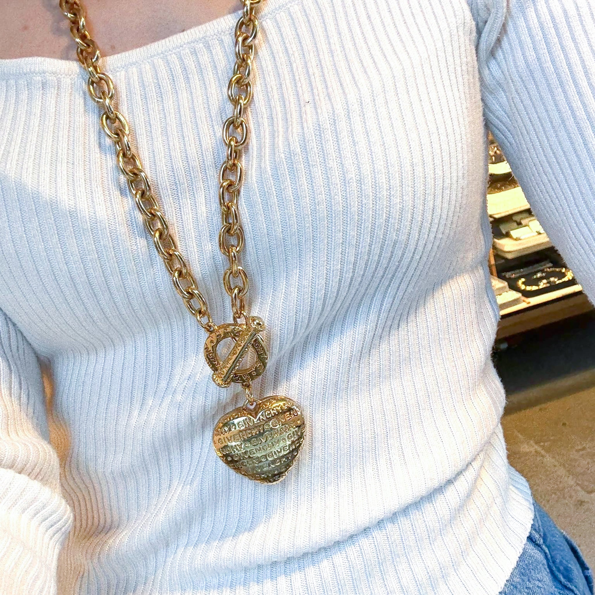 This beautiful vintage Givenchy necklace features a bold, gold-tone chain finished with a signature toggle clasp and an iconic heart-shaped pendant. The pendant is embossed throughout with the GIVENCHY logo.