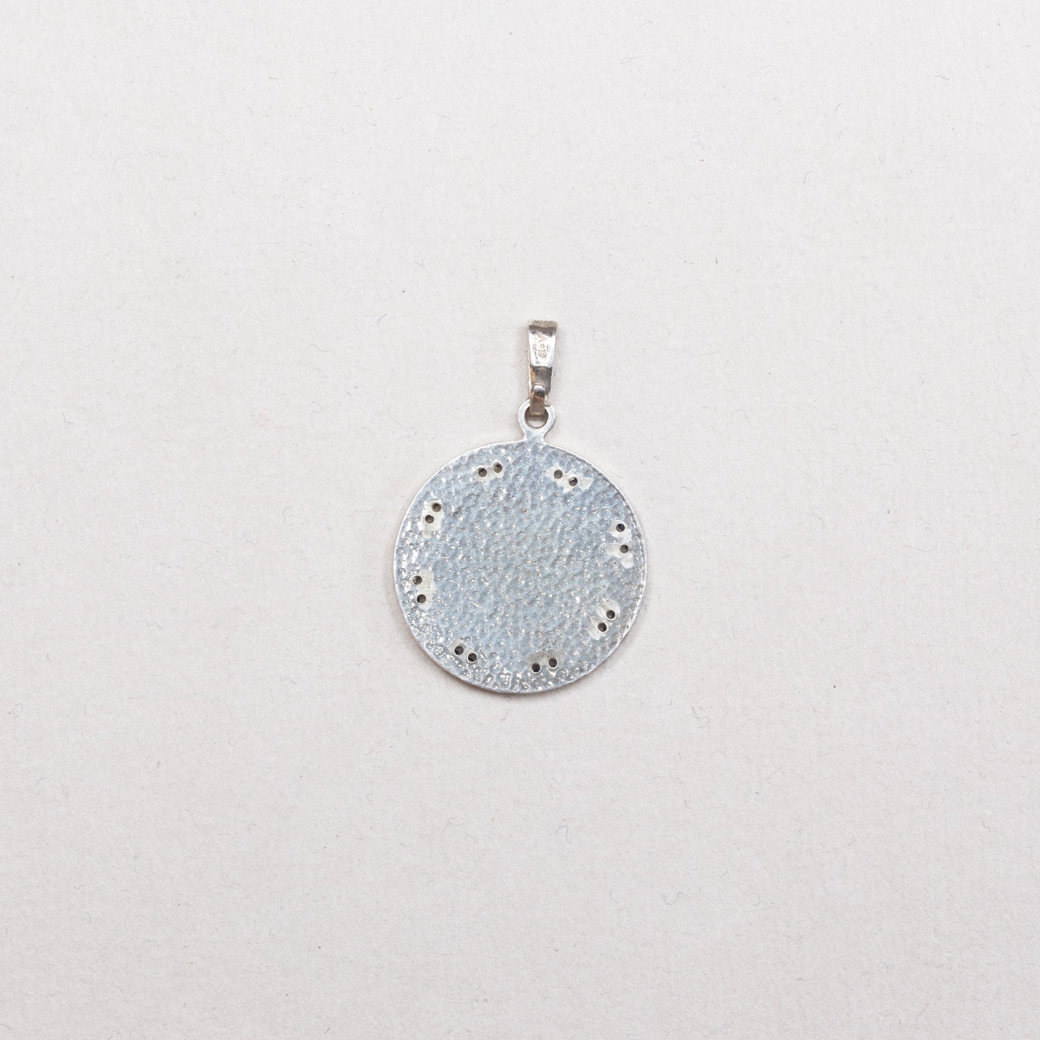Made of sterling silver with sapphires, this pendant measures 21 mm in diameter with a 8 mm jump ring.