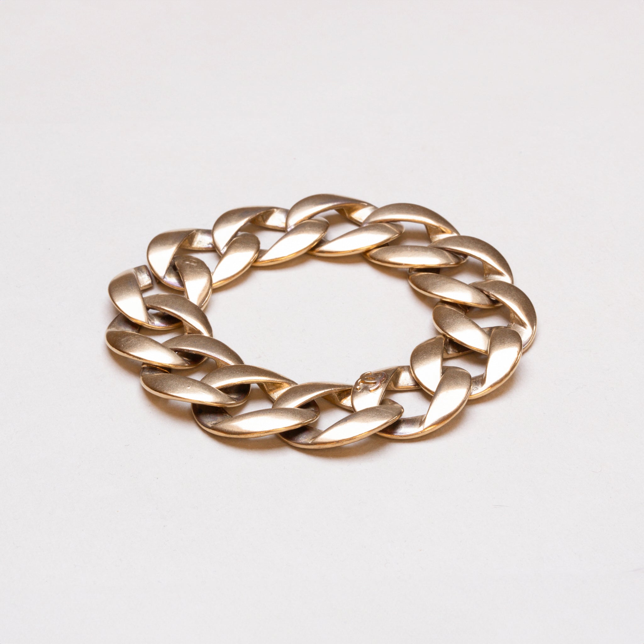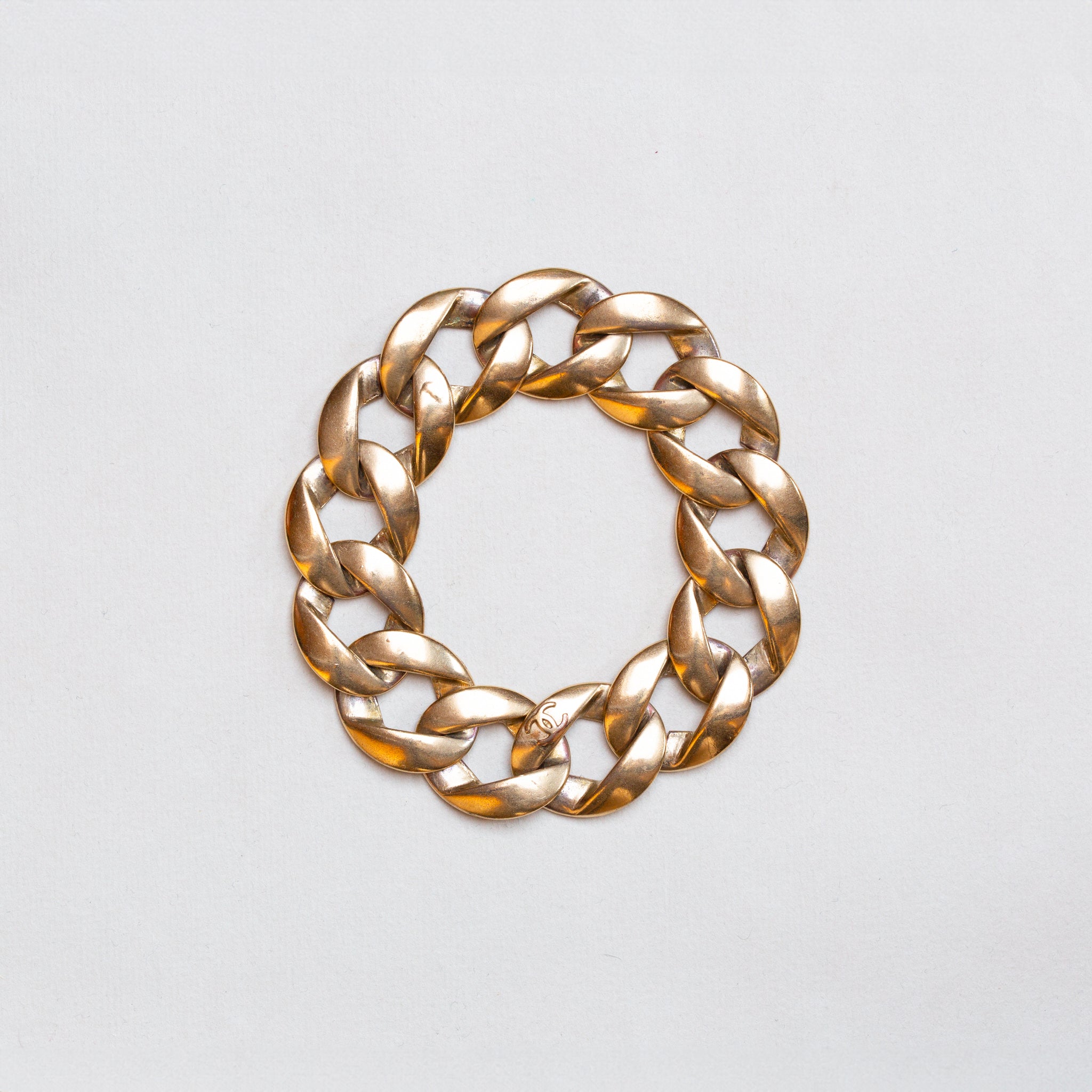 This striking vintage Chanel bracelet features the house’s iconic oversized chain-link design, crafted in a rich, gold-tone finish.