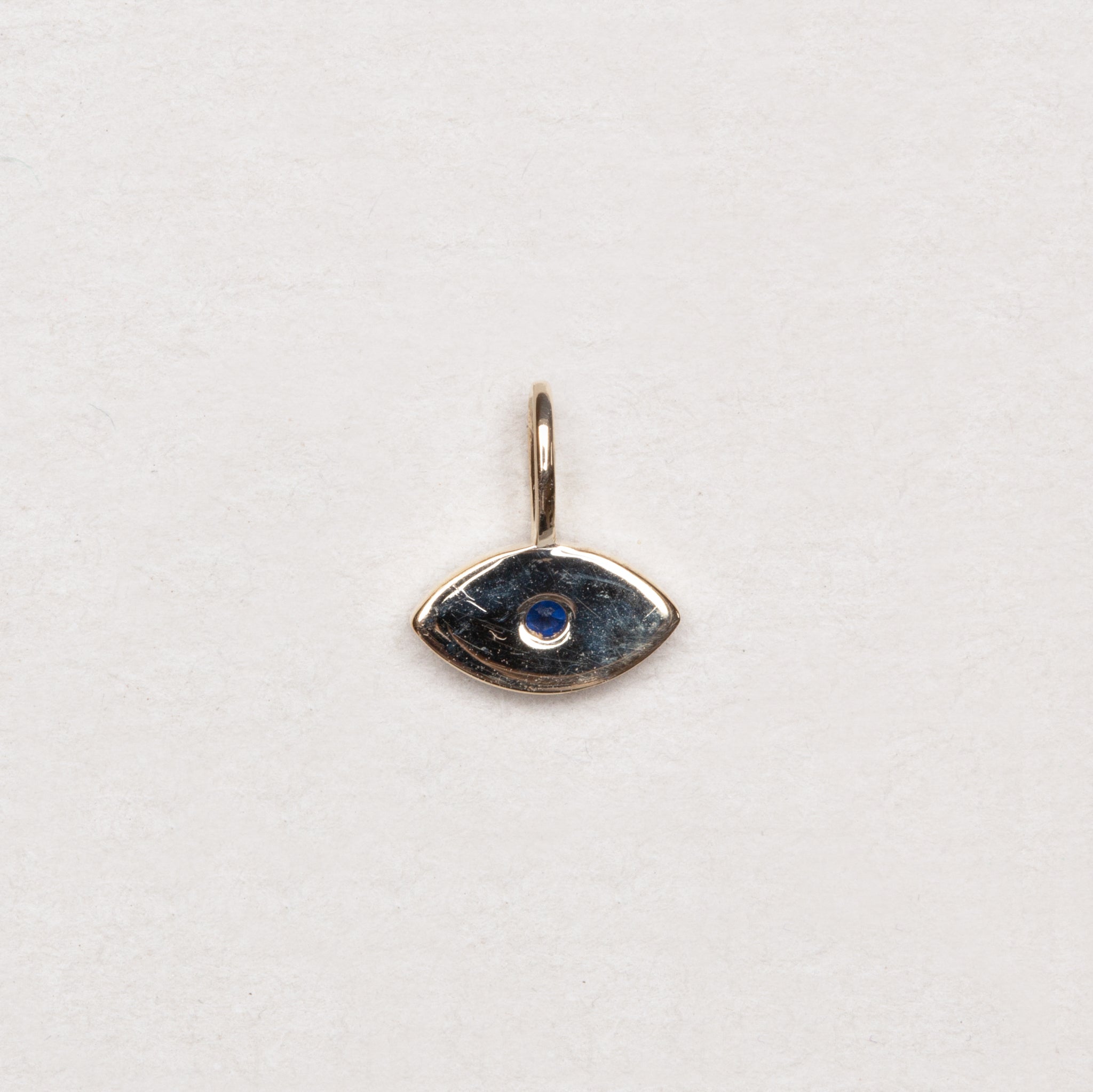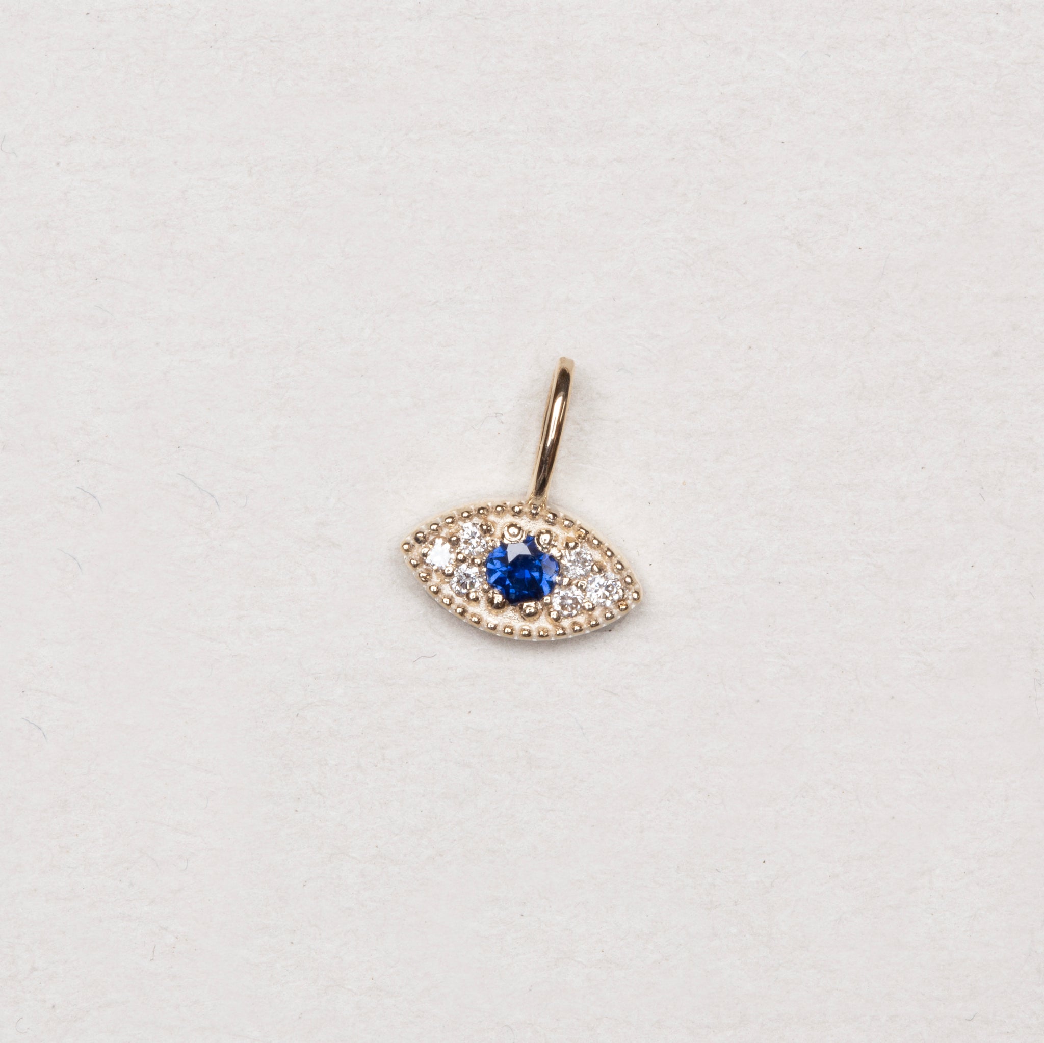 Capture a touch of mystical protection with this exquisite 14ct gold evil eye charm, beautifully set with sparkling diamonds and a vibrant sapphire-blue centre stone. This delicate, eye-shaped charm is finished with intricate milgrain detailing, making it a perfect addition to a curated bracelet or a dainty necklace.
