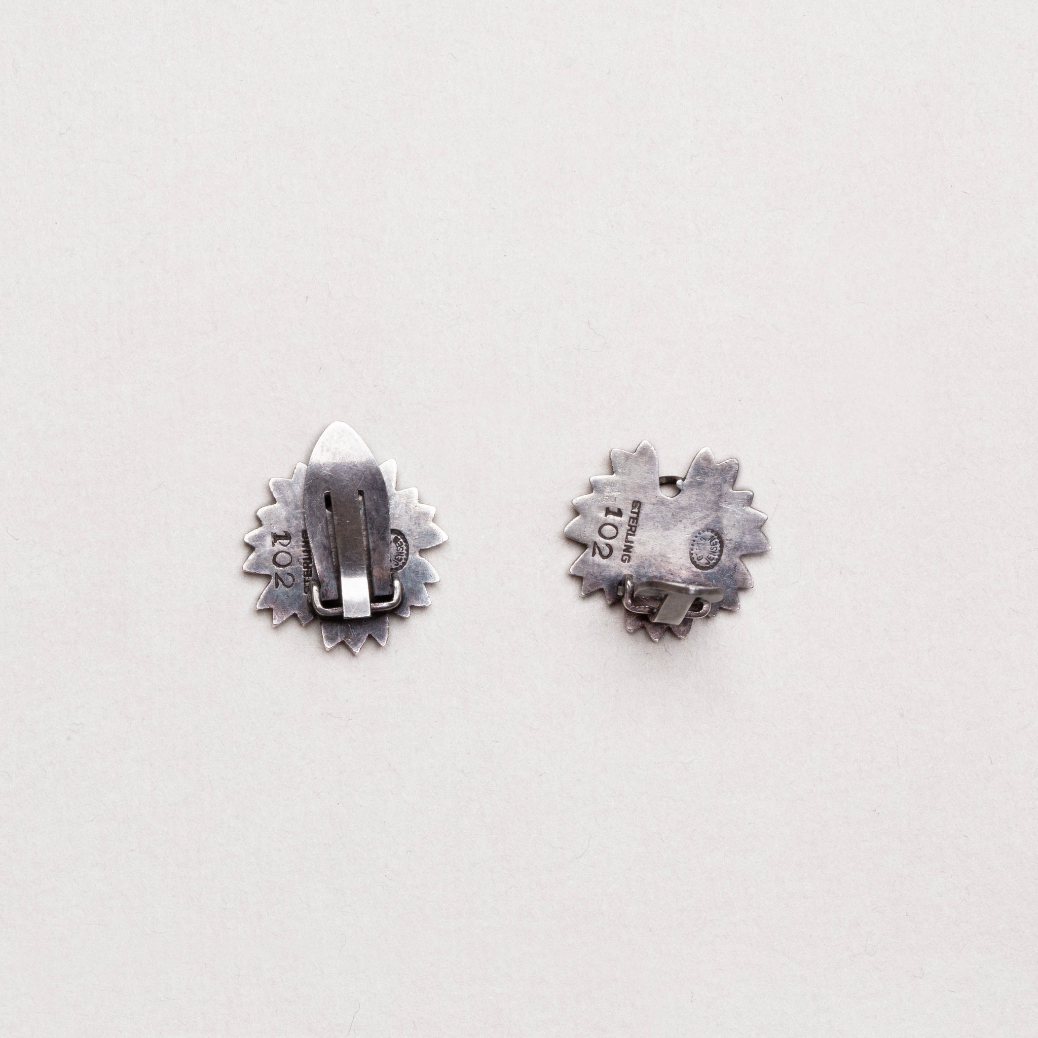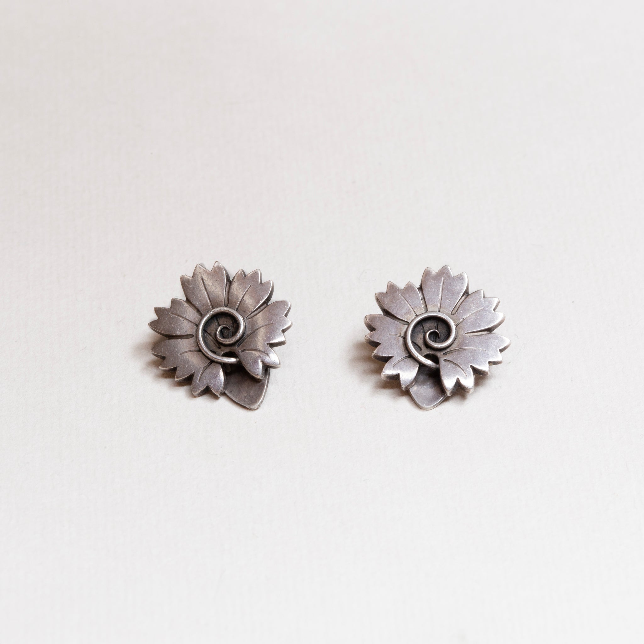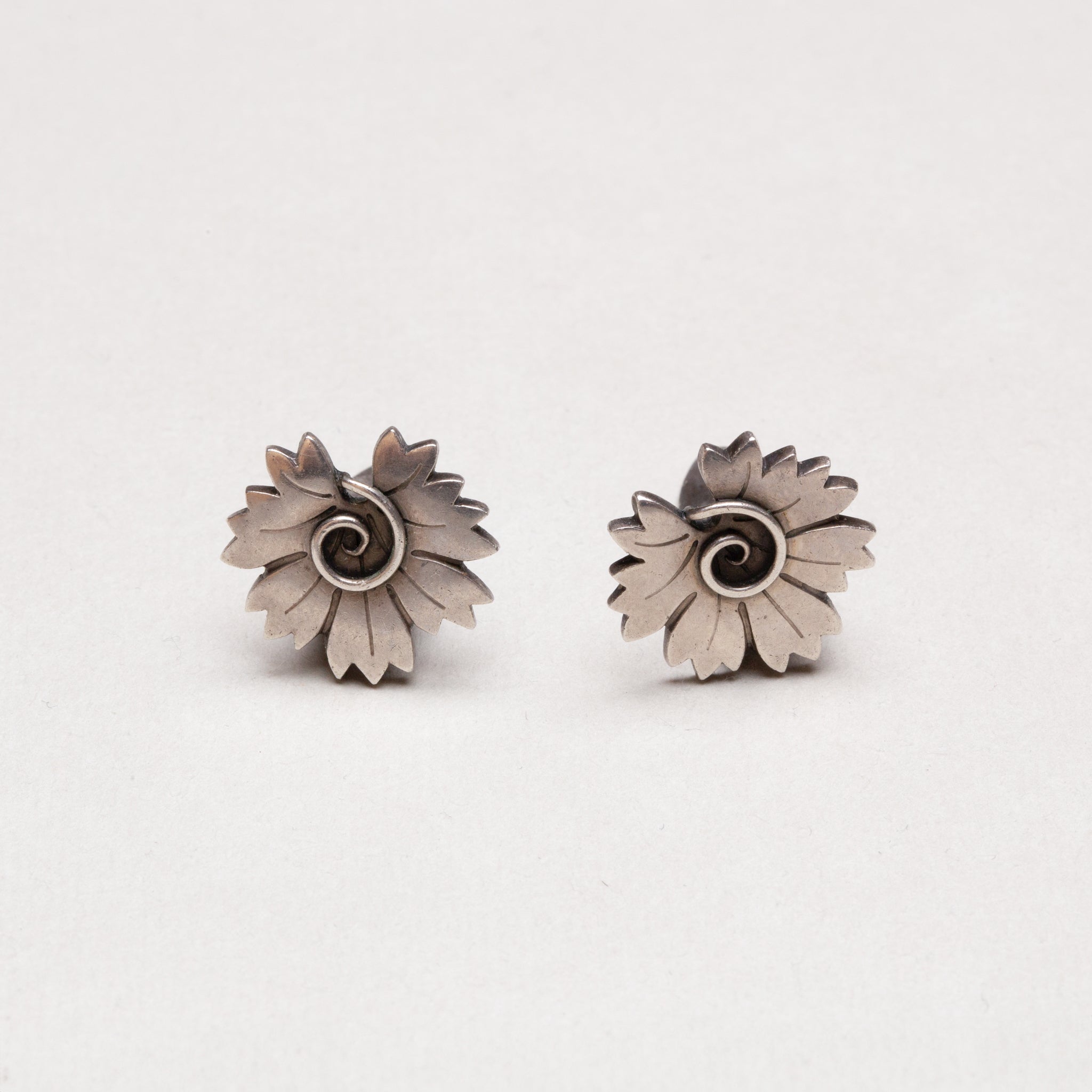 Vintage Georg Jensen clip-on earrings crafted in sterling silver, designed in a stylised floral motif. Each earring features layered petals radiating from a central spiral, combining organic curves with crisp detailing characteristic of Jensen’s Scandinavian design aesthetic.